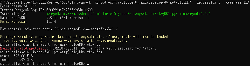 mongosh "mongodb+srv://cluster0.jnxzx3s.mongodb.net/blogDB" --apiVersion 1 --username 123 -