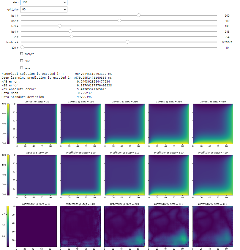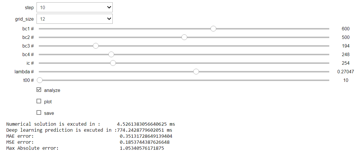 - Tick analyze to view Timing of numerical solution and deep learning solution, and Error metrics.