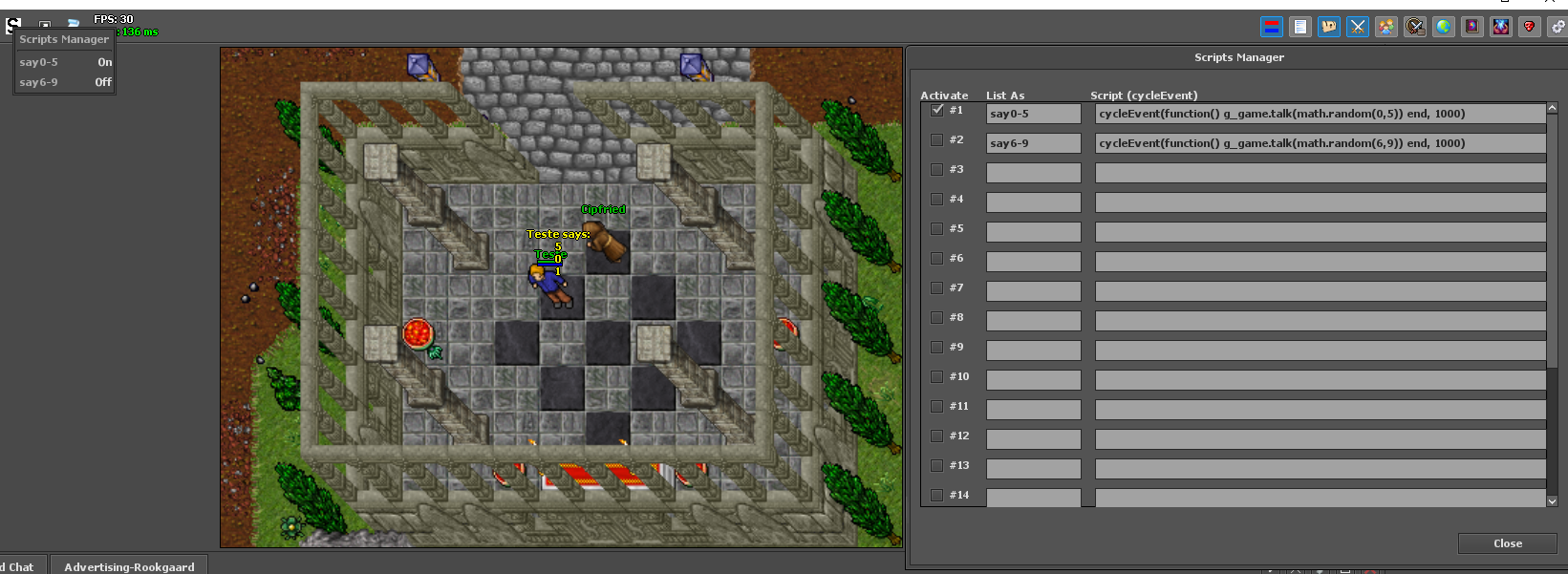 This mod can be used to manage your scripts on otclient, many players use cycle events direct on console and this is can get really annoying when you play with lots of scripts, this mod is intended to handle your cycleEvent scripts togheter and allow you to turn them on and off with ease.