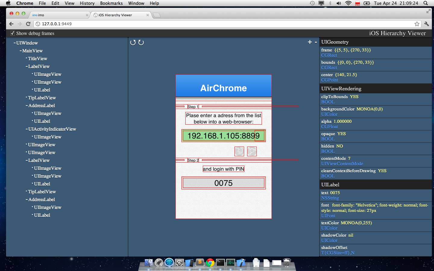 - launch hierarchy viewer in your code by calling [iOSHierarchyViewer start];. The best place for it is AppDelegate::applicationDidBecomeActive callback