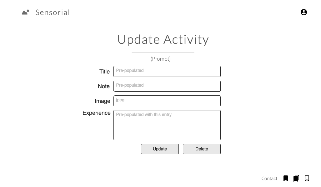 Each journal entry displays the activity title, the image the user uploaded (if they chose to do so), and the experience description that they added to that journal entry. The user has an edit button at the bottom that takes them to the update page. This page contains the same fields as the "new activity" page but those fields are populated with the existing content already. The user is able to edit whatever they choose to and either update the entry, or delete the entire entry if they choose to. This page redirects the user to the page for that specific activity upon submission of the edit, or the activity journal upon delete.