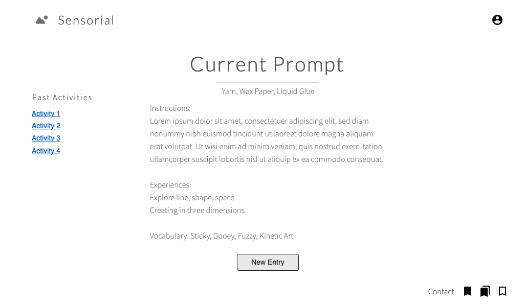 After the user logs in they're taken to their "home", the current prompt page. Also, once logged in, the pages also contain a navigation column to the left that shows the list of previous activities that the user can click to see the full journal entry for each past project. The current prompt page shows the current week's activity prompt as well as the materials, instructions, experience goals, and suggested vocabulary to use with their child. There are buttons on this page to take them to the new activity page, to see a random prompt, or to see their activity journal. The random prompt page pulls from a variety of prompt options for the user and they can navigate to a new activity, the activity journal, or go back to the current prompt page from there.