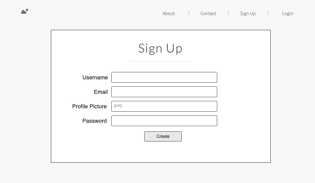 The user begins on the landing page where they are greeted by the logo, and a nav bar to the top right contains options to read more about the app, contact, sign up, or log in. Upon clicking sign up, the sign up modal pops up and the user is asked to enter their username, email, password, and optionally link a profile picture. Alternatively, if they already have a profile they can click login and only need to enter their username and password.