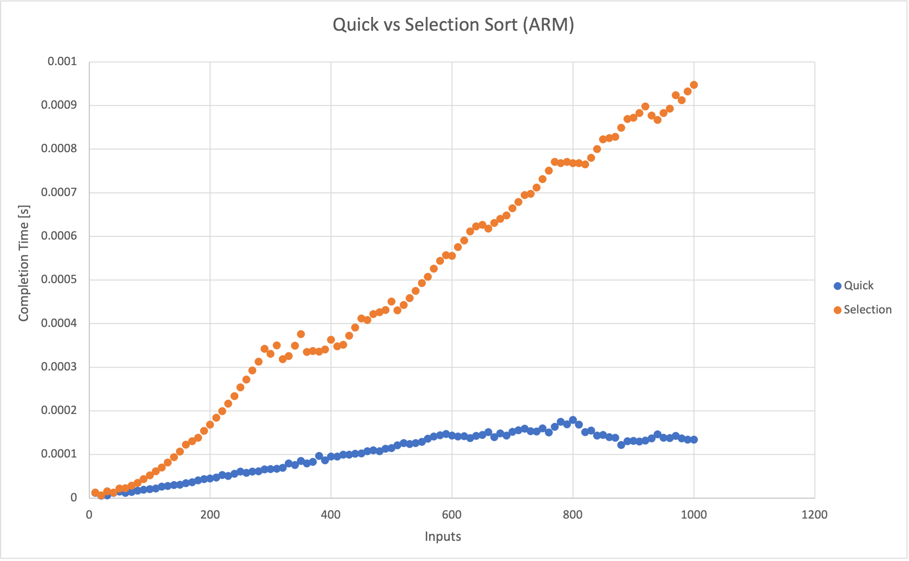 This Project was complied in clang and ran on an ARM Macbook Pro. The goal of this code was to explore the run times of two different algorithms, Quicksort and Selection Sort.