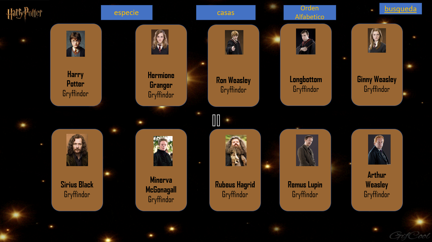 - Casas (Griffindor, Slytherin, Hufflepuf, Ravenclaw)