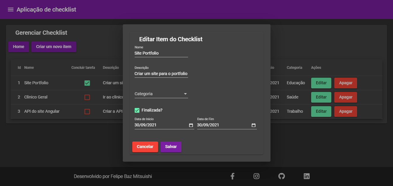 The footer section, was made where there are the principal social networks of the developer, as well as the copyright reservation of the site.