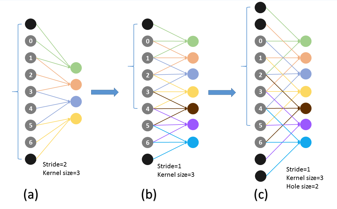 这个解决办法就是采用 Hole 算法。如下图 (a) (b) 所示,在以往的卷积或者 pooling 中,一个 filter 中相邻的权重作用在 feature map 上的位置都是物理上连续的。如下图 (c) 所示,为了保证感受野不发生变化,某一层的 stride 由 2 变为 1 以后,后面的层需要采用 hole 算法,具体来讲就是将连续的连接关系是根据 hole size 大小变成 skip 连接的(图 (c) 为了显示方便直接画在本层上了)。不要被 (c) 中的 padding 为 2 吓着了,其实 2 个 padding 不会同时和一个 filter 相连。