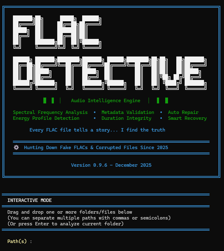 FLAC Detective is a professional-grade command-line tool that analyzes FLAC audio files to detect MP3-to-FLAC transcodes with high precision. Using advanced spectral analysis and an 11-rule scoring system, it helps you maintain an authentic lossless music collection.