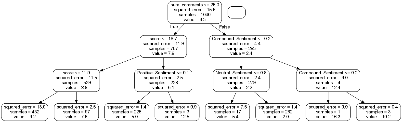 After preprocessing all of the data and aggregating it all into one nice pandas data frame, we can now look for interesting correlations within the data. Because we have the power of computer science and data science, instead of plotting a bunch of scatter plots to find correlations, we first ran a random forest regression to determine the most important features within the data. We decided to use a random forest regression because we are trying to predict a continuous variable, closing stock price, based on our inputs, which were the Reddit features. Using the feature_importances_ function, we found that the number of comments (0.44) and score, which is the aggregate of upvotes and downvotes (0.27), were the most important features in predicting the price of GameStop.