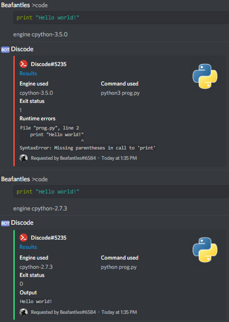 'status'was displayed when submitting some codes. - Fixed bot's description (which was stating that only C++ was supported).
