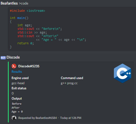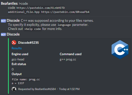 int a = 1337;You may want to set a specific compiler / interpreter for evaluating your code. You can specify it using the engine parameter. You can list all available engines for an available language using the [p]list_engines language_name command.