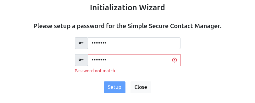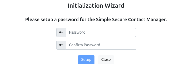 It firstly comes with an initialization page. It requires you to provide a password for the secure contacts. You need to provide a password match to enable the "Setup" button.