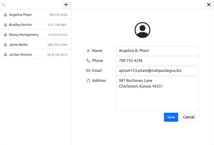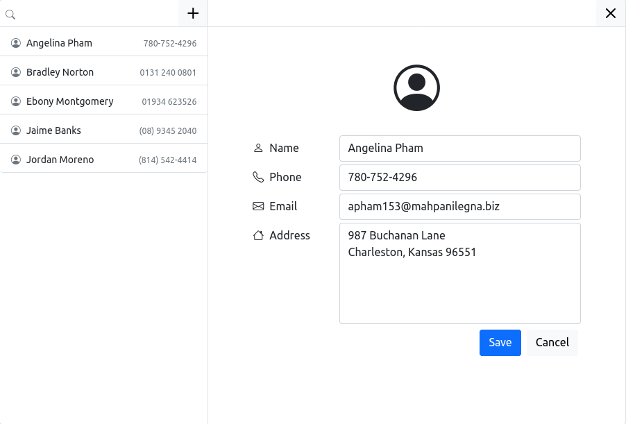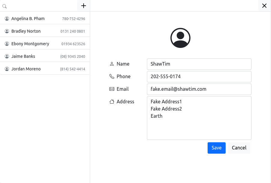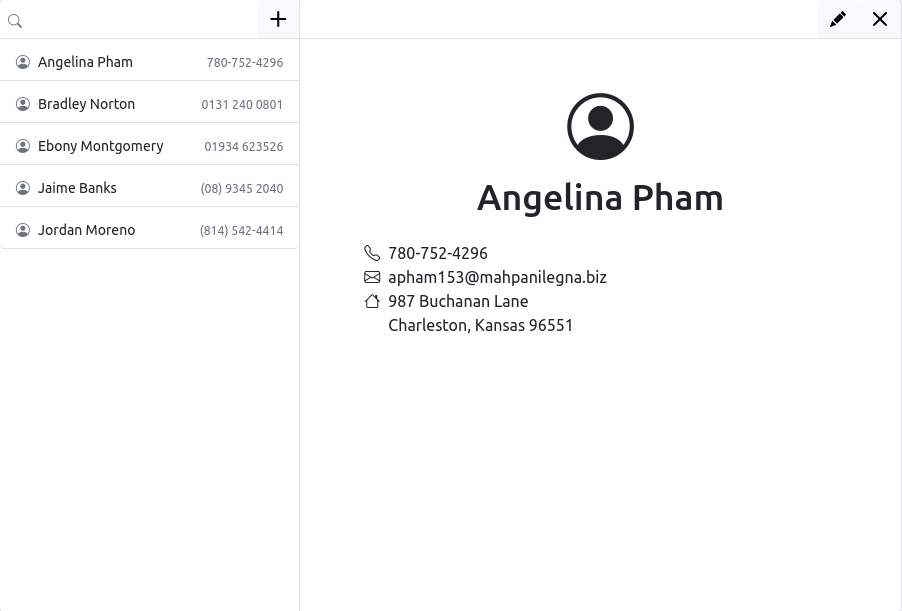 datastorePath: the file path for the encrypted data file to be stored, default is./contacts.data. On Linux that will be next to the application, on Windows it will be located at somewhere likeC:\\Users\\{USER}\\AppData\\Local\\Temp\\{APP_NAME}\\contacts.datadefaultContacts: this is an array of contact data that will be pumped into the data file when the application initialized such that the user can play around with some data instead of nth. The data is generated, not real-life data.