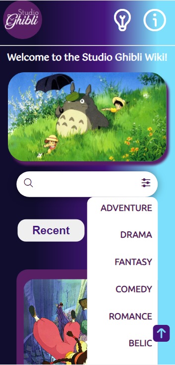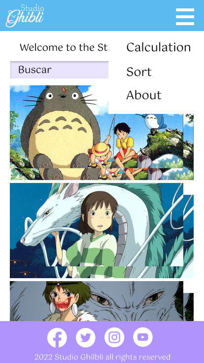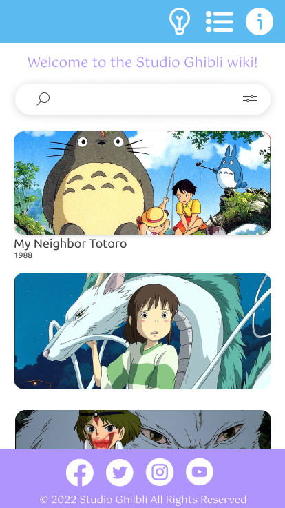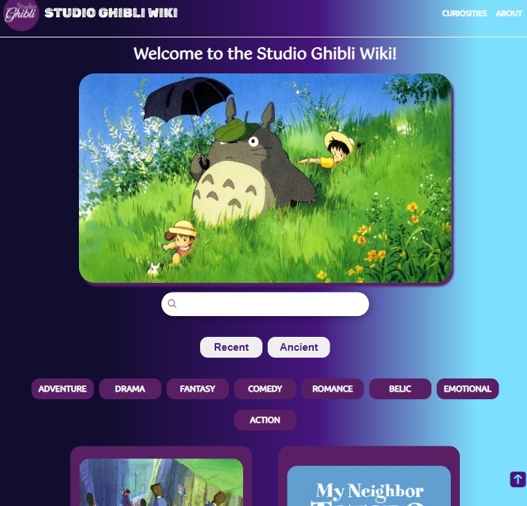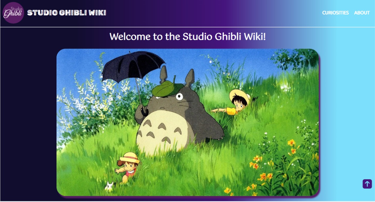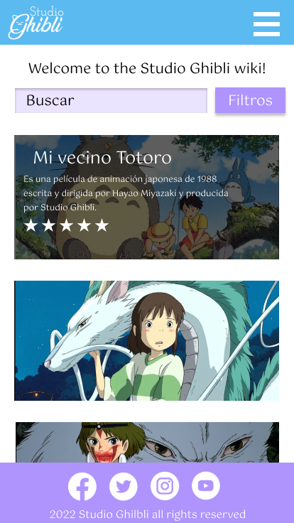 Studio Ghibli wiki es una wikipedia de información acerca de las películas de Studio Ghibli, con sus descripciones, personajes, locaciones, vehículos y otras características. En este proyecto se utilizó data estática que manipulamos dinámicamente para crear elementos html, se realizaron funcionalidades puras de filtrado, ordenado y cálculos estadísticos que se incorporaron a la wiki, además de ser completamente responsive.