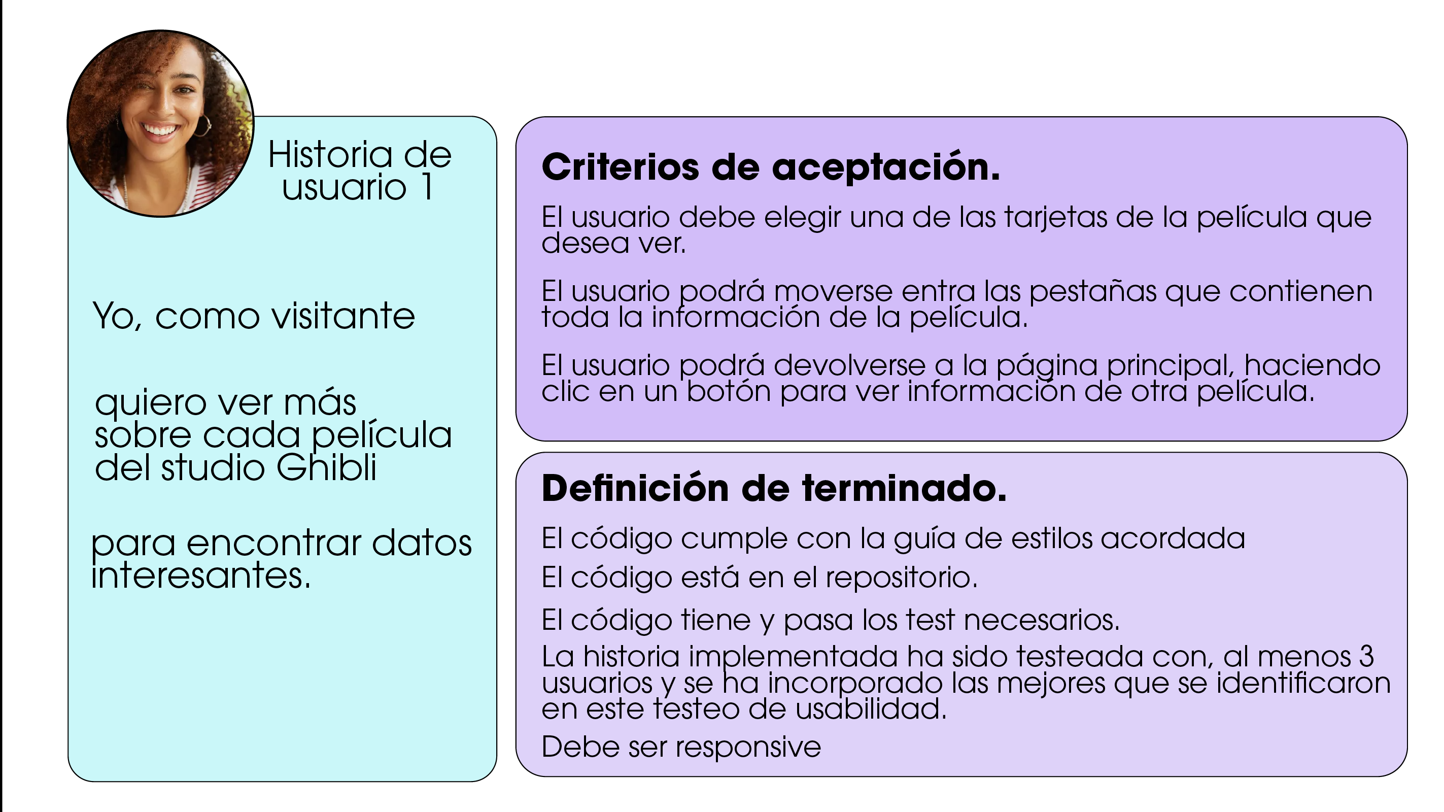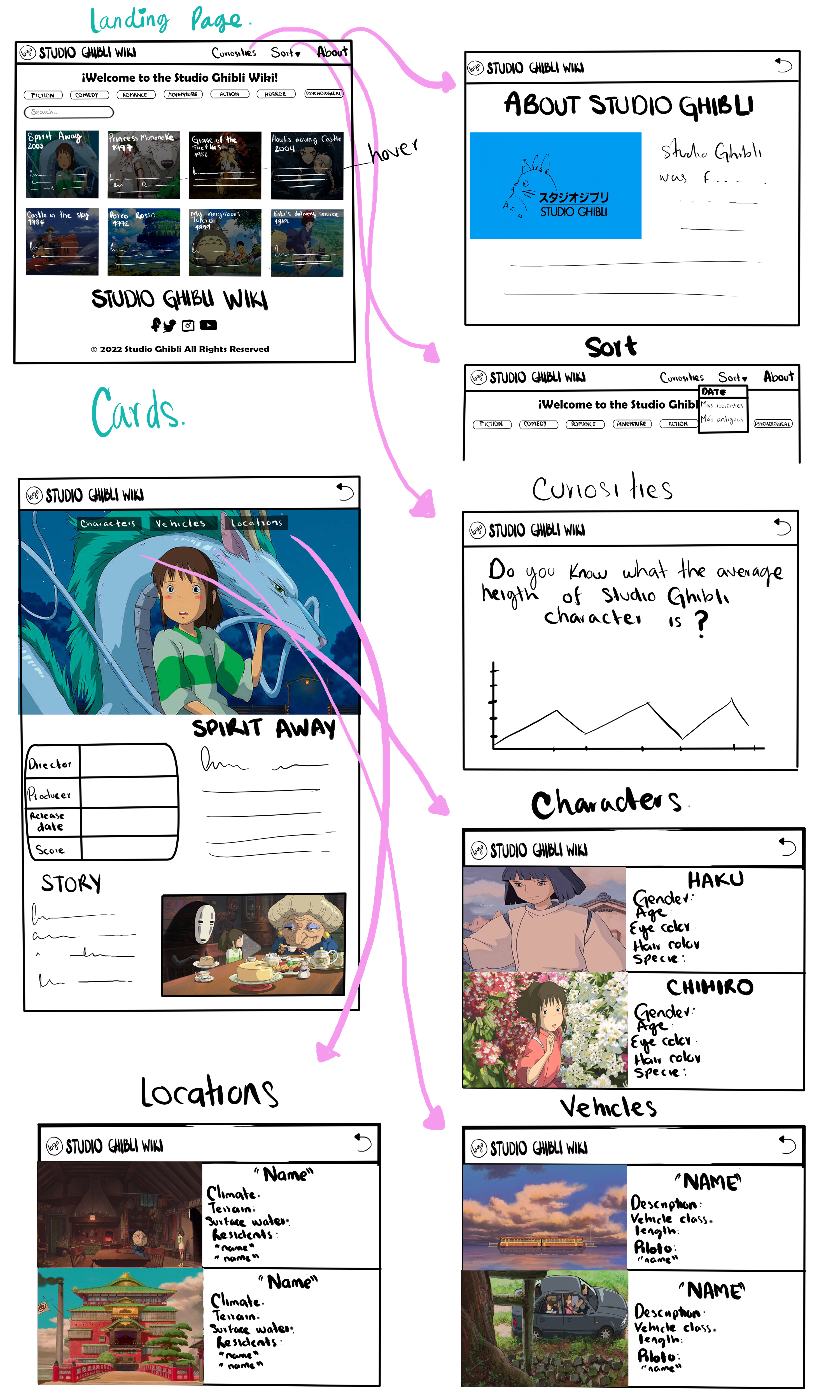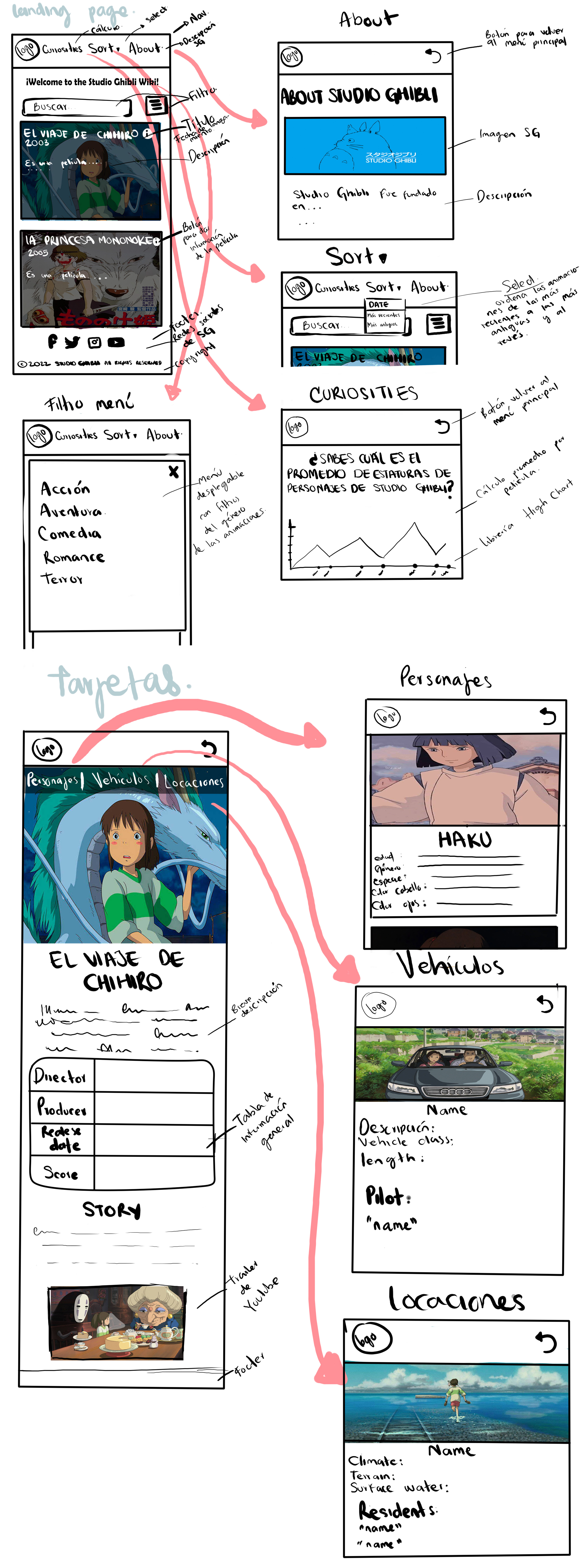 El objetivo de este proyecto es dar información a los usuarios sobre las películas realizadas por Studio Ghibli durantes estos años. Lo primero que hicimos fue realizar bocetos en programas de diseño y organizar la información de Studio Ghibli tomando disposición de los espacios, tipo de letra, íconos, paleta de colores, y en general.