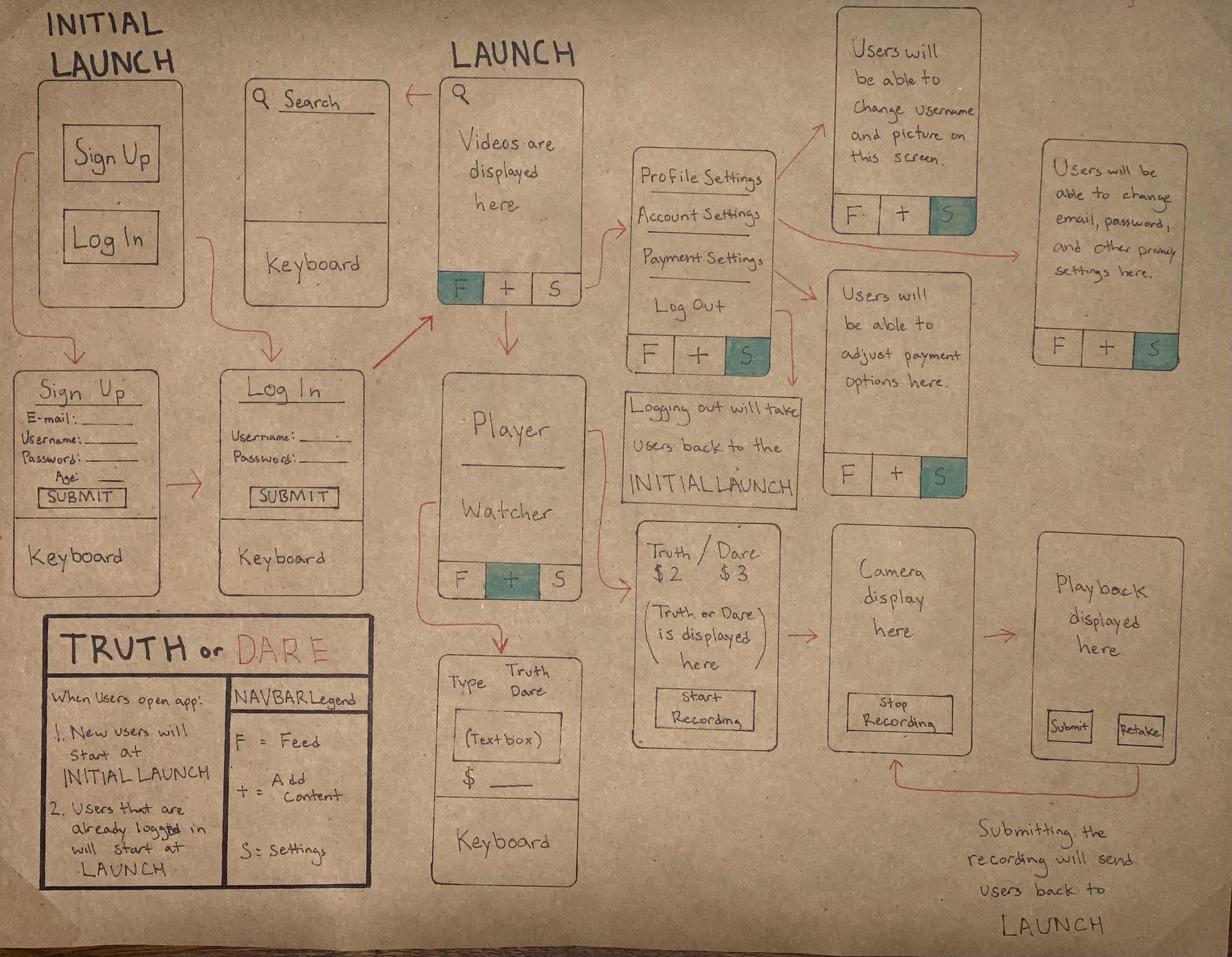 - Scope: First this app will just start off as a simple "truth or dare" app. In the future we could add certain monetization options so "players" could be incentivized to do certain "truths" or "dares".