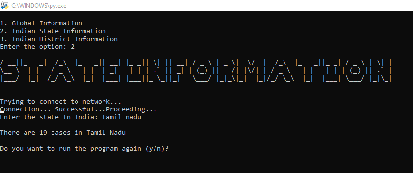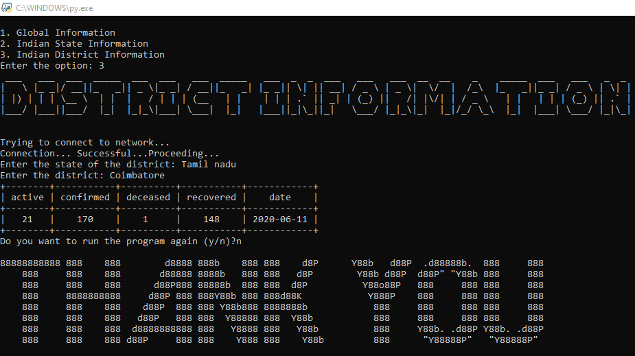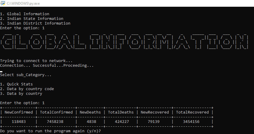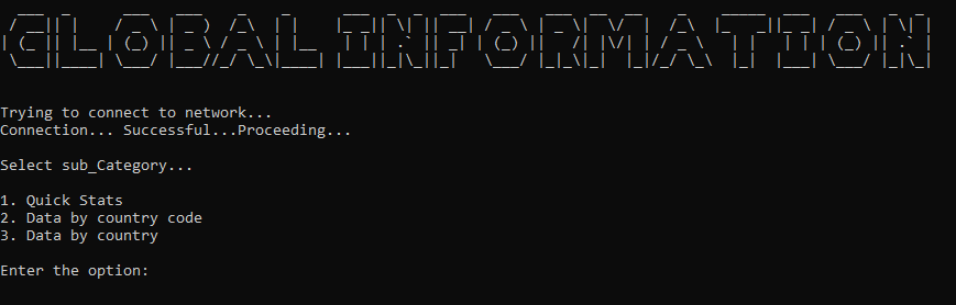 PROJECT-COVID These Are Some Of The Outputs of The Code 1. Main Interface 2. Global Information Interface 3. Global Information Quick Stats 4. Global Information By Country Code 5. Global Information By Country Name 5. State Information 6. District Information 7. End Of Code