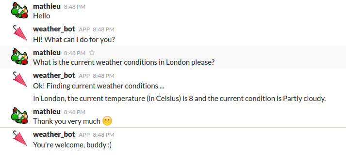 - detect the following intents: Greetings, Thanks and when you ask for the weather.