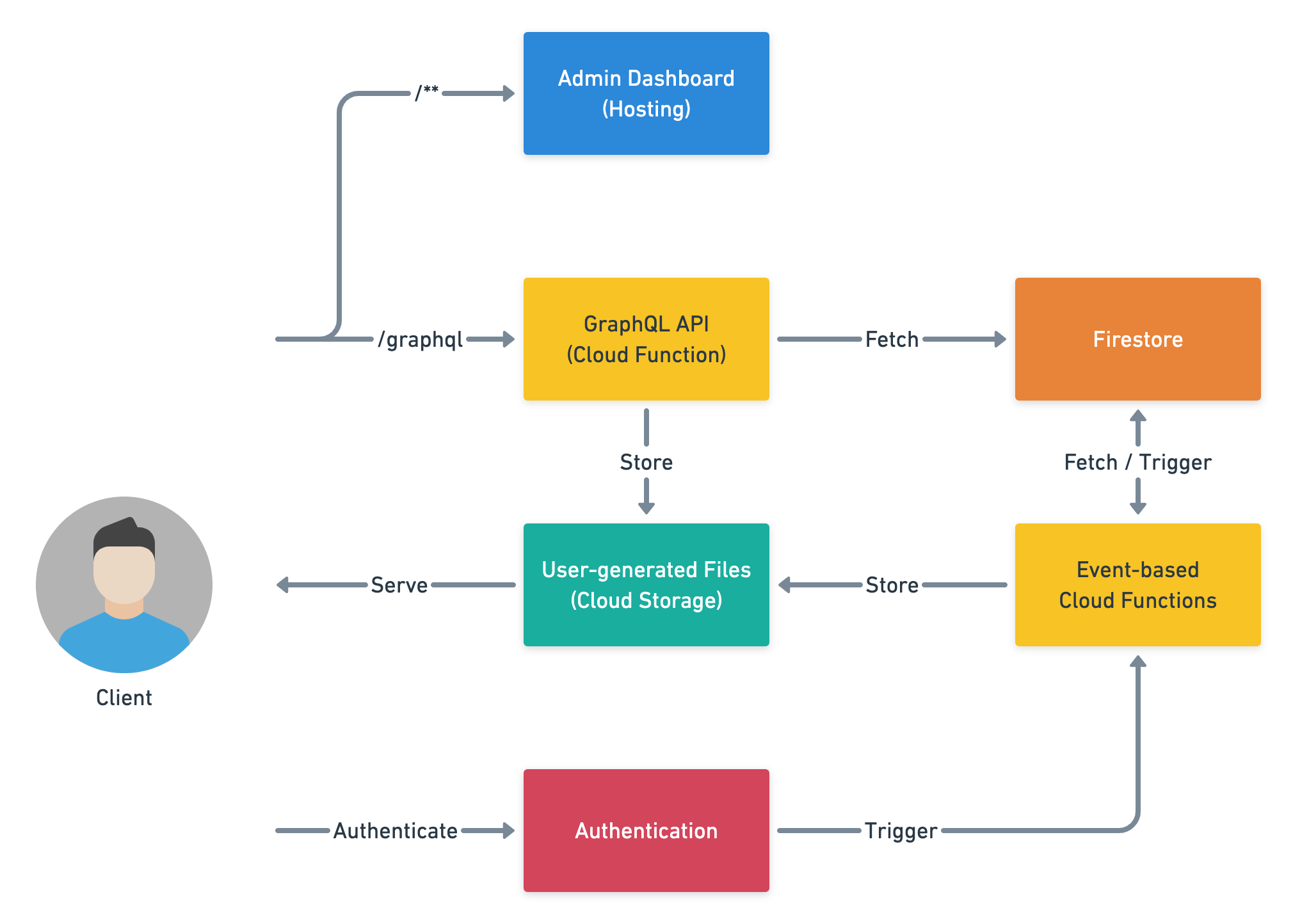 - We're using Firestore as a datastore that allows alomost infinite number of connections. So that we can use cloud functions as a Web API.