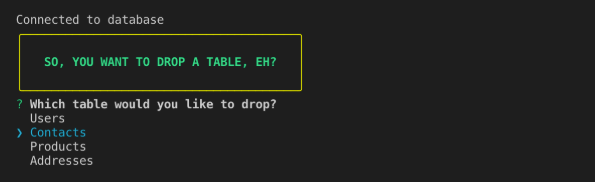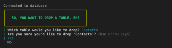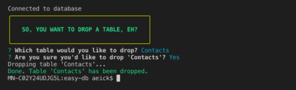 After you have select the table you want to drop and confirmed your selection, the CLI will execute the DROP TABLE command. Once finished, you will recieve confirmation from the CLI that the table has been dropped.