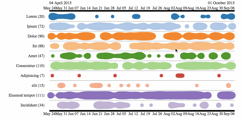 A time based / event series interactive visualization using d3.js. Use drag and zoom to navigate in time. See the demo