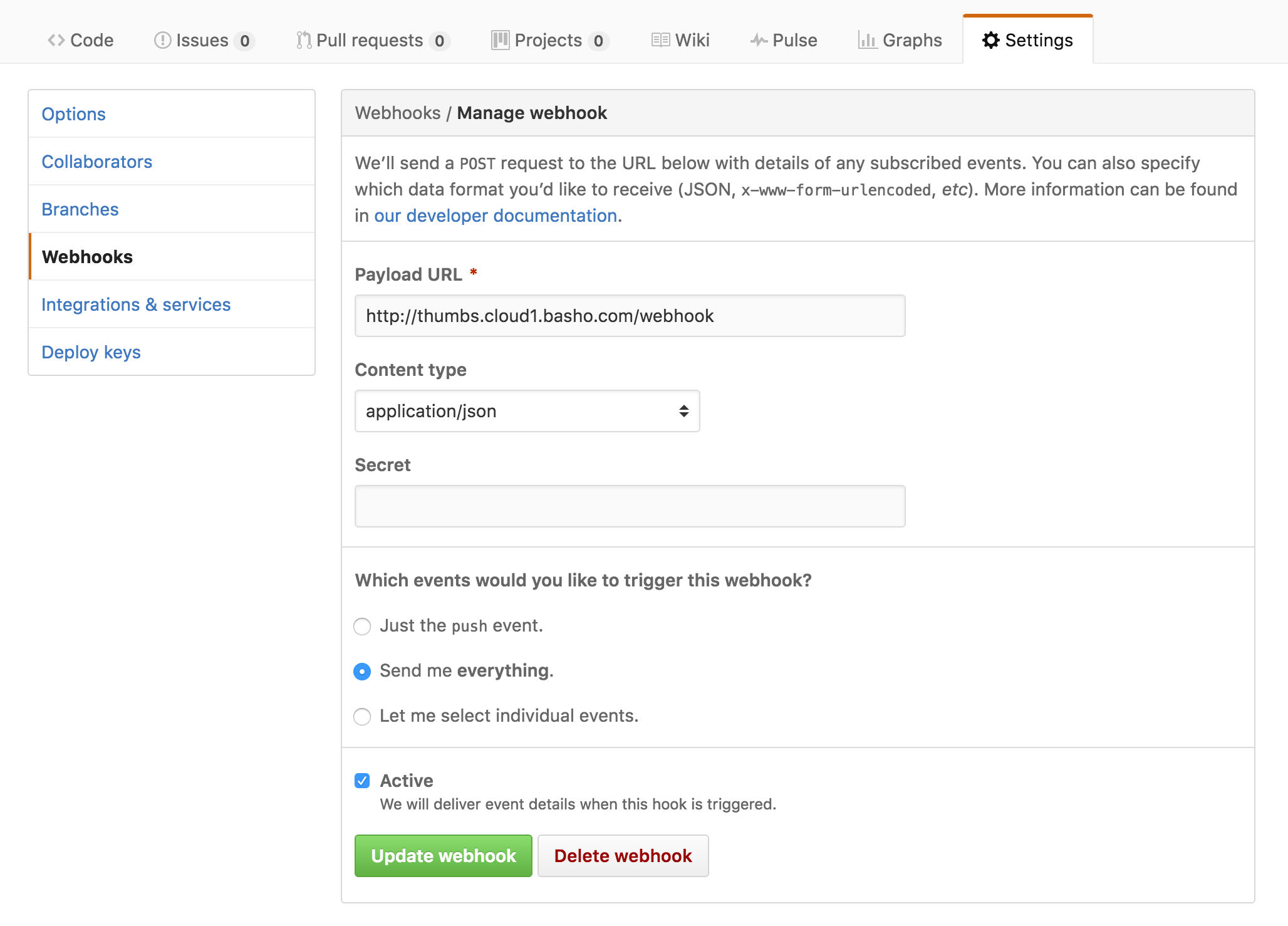 - Set Payload URL to: http://thumbs.cloud1.basho.com/webhook