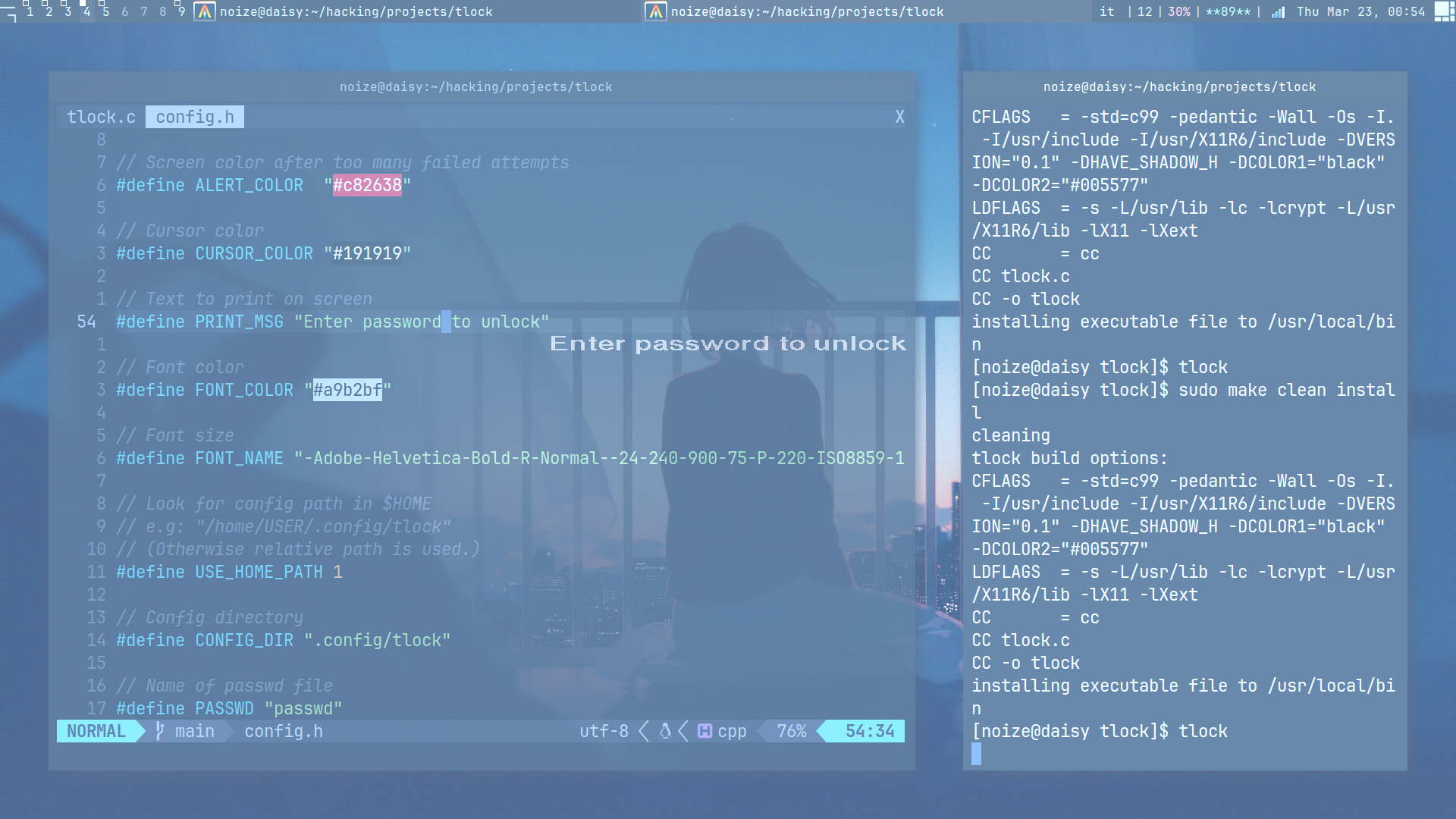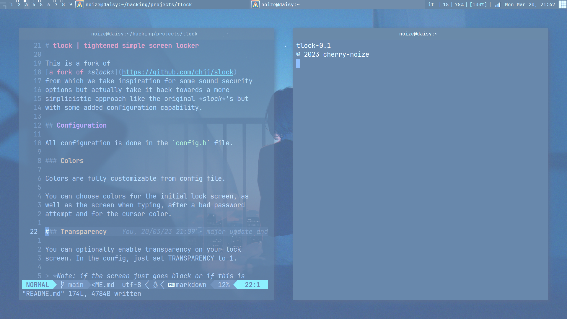 This will blur all backgrounds on translucent ARGB windows, expect for those in the exclude rule. This might improve readability and also appearance according to one's preference, but will generally have a lesser impact on most windows since they tend to render with high opacity values. tlock can be set to be fully transparent, achieving a powerful background blur.
