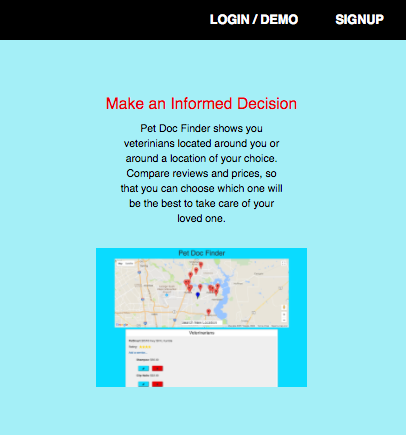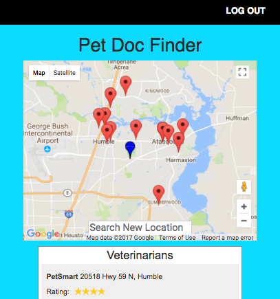 This web app helps people to find the prices of veterinarian services around a location of their choice. My sister told me that every time she moved, one of the first thing she would do is find a veterinarian. She always had difficulty comparing the prices of their services. After researching, I found that not very many veterinarians post their prices on their websites, so I made this app to help pet owners have access to more information in order to compare different veterinarians in their desired location.