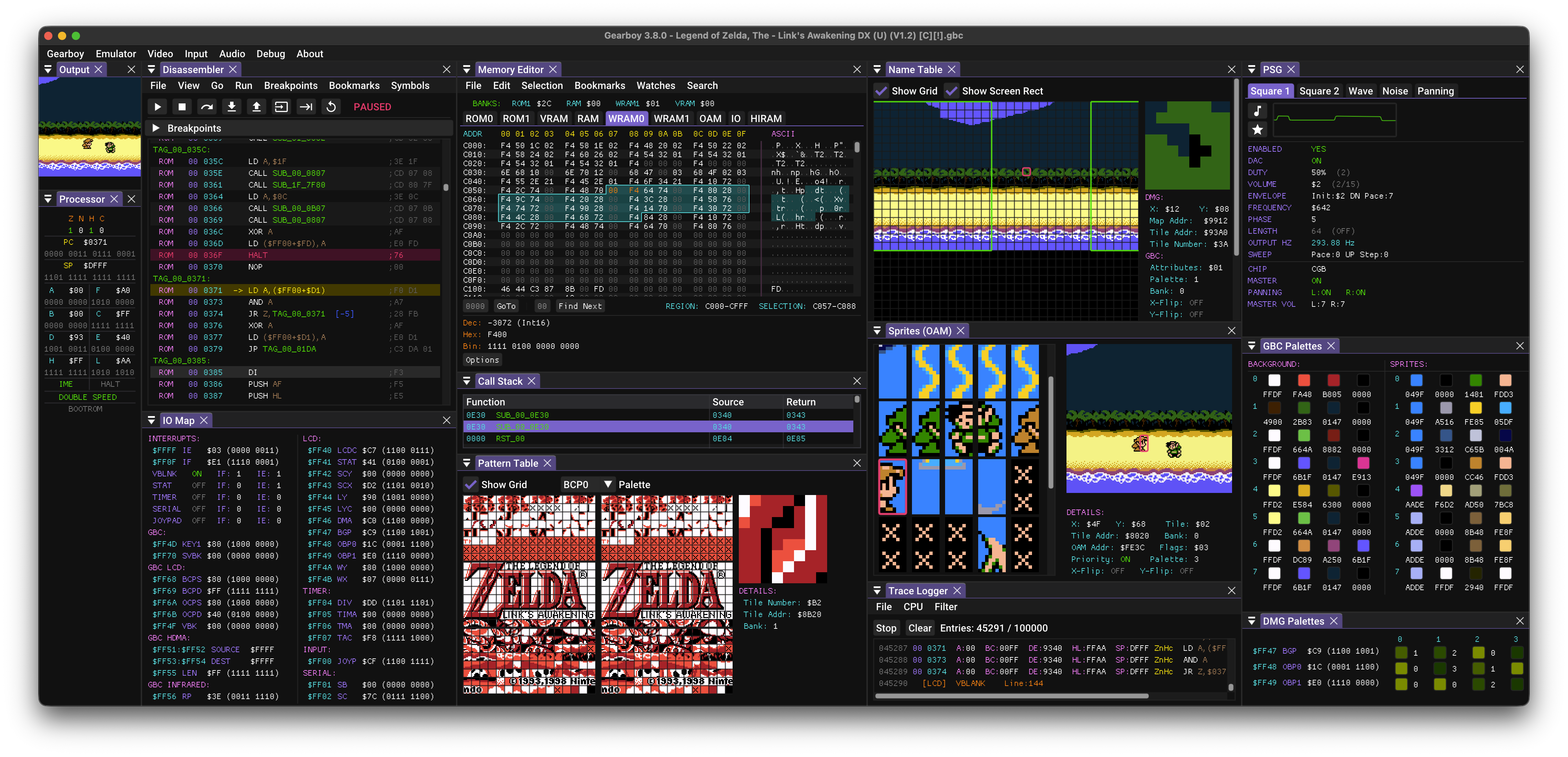 - Full debugger with just-in-time disassembler, CPU breakpoints, memory access breakpoints, code navigation (goto address, JP JR and CALL double clicking), debug symbols, automatic labels, memory editor, trace logger, IO inspector and VRAM viewer including tiles, sprites, backgrounds and palettes.