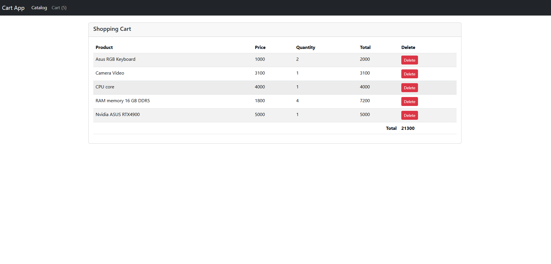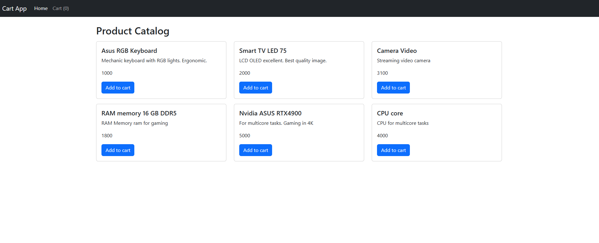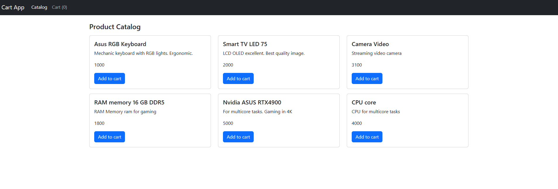 Project generated with Angular CLI version 17.3.12. The project is structured in one component that has some subcomponents, some of them has another subcomponents. It can be saw how the data is passed across the components in either directions. Actions such as adding and deleting elements filling a Shopping Cart that can be displayed as a hidden div or as a modal by clicking on the navbar. Values of Shopping Cart remains stored by saving them on sessionStorage. Styles with Bootstrap version 5.3.