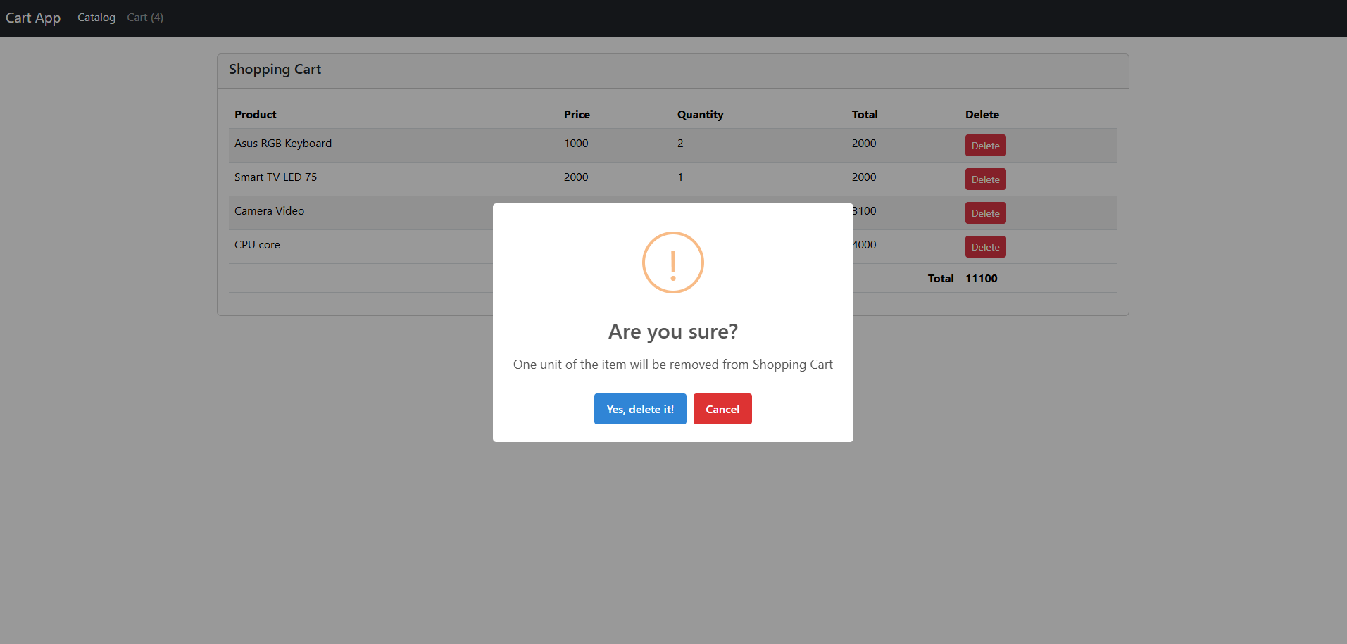 Alert displayed when trying to delete an item from Shopping Cart: