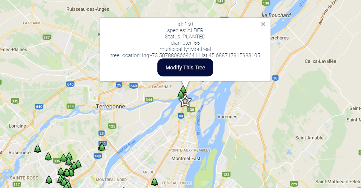 Logic rules are also implemented to make sense for modifying a tree. For example, a cutdown tree cannot be updated to healthy. Another example, A resident cannot set a tree to diseased unless he/she introduced that tree into the system. Therefore, Login is required when modifying trees.