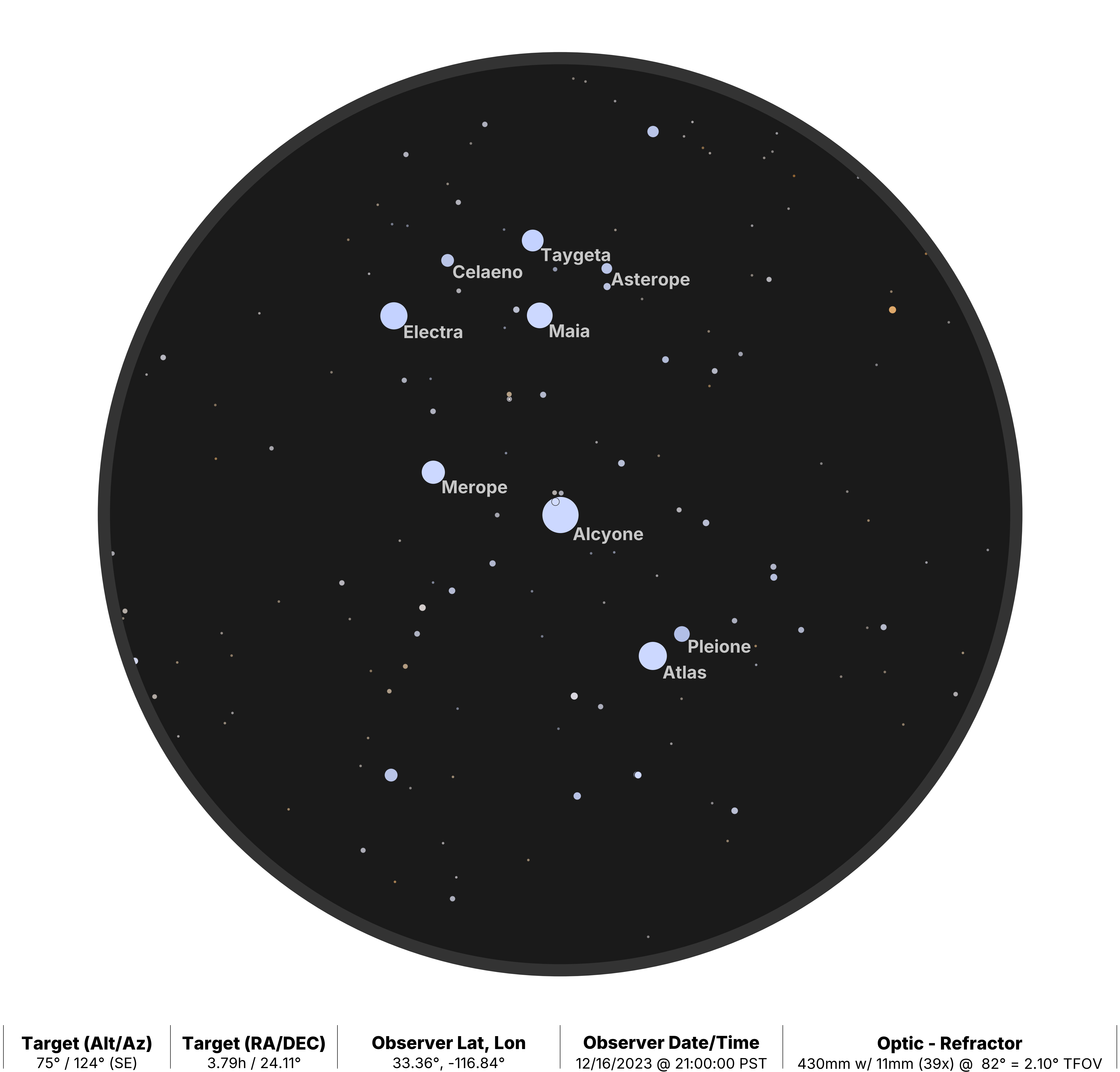 The Pleiades star cluster, as seen through a refractor telescope from a specific time and location: