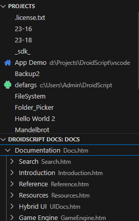Many new dialogs and features were added to the UI. This includes updated project view which displays project icons and local paths, and an updated docs tree view that is now collapsible based on lists found in the rendered document. When you are not connected to DroidScript the docs are loaded from droidscript.github.io