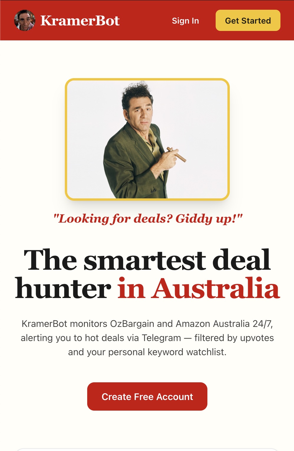 A Telegram bot — and now a full web app — to get you the latest deals from https://www.ozbargain.com.au and https://amazon.com.au. Let Kramer watch deals so you don't have to. Giddy up! A Telegram bot — and now a full web app — to get you the latest deals from https://www.ozbargain.com.au and https://amazon.com.au. Let Kramer watch deals so you don't have to. Giddy up! A Telegram bot — and now a full web app — to get you the latest deals from https://www.ozbargain.com.au and https://amazon.com.au. Let Kramer watch deals so you don't have to. Giddy up!