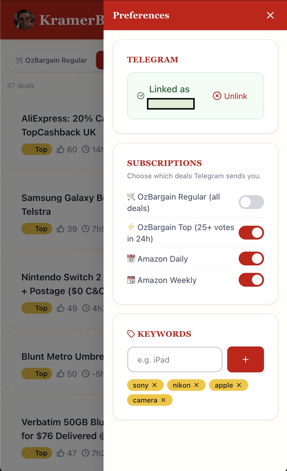 Browse today's deals; manage keywords; link Telegram |