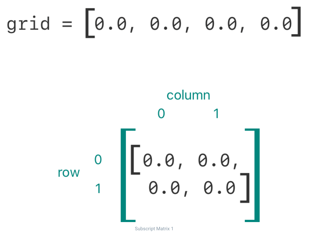 Matrix 인스턴스의 grid 배열은 아래와같이 왼쪽 상단에서 오른쪽 하단으로 읽는 것처럼 행렬의 평면화 버전이다.