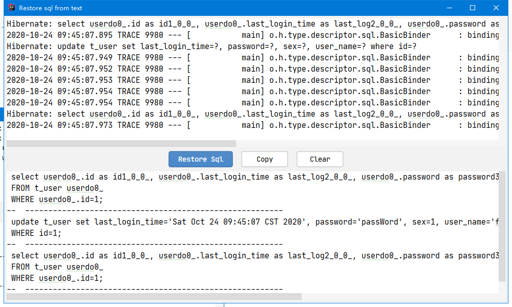 2020-10-24 09:45:07.952 TRACE 9980 --- [ main] o.h.type.descriptor.sql.BasicBinder : binding parameter [2] as [VARCHAR] - [passWord]