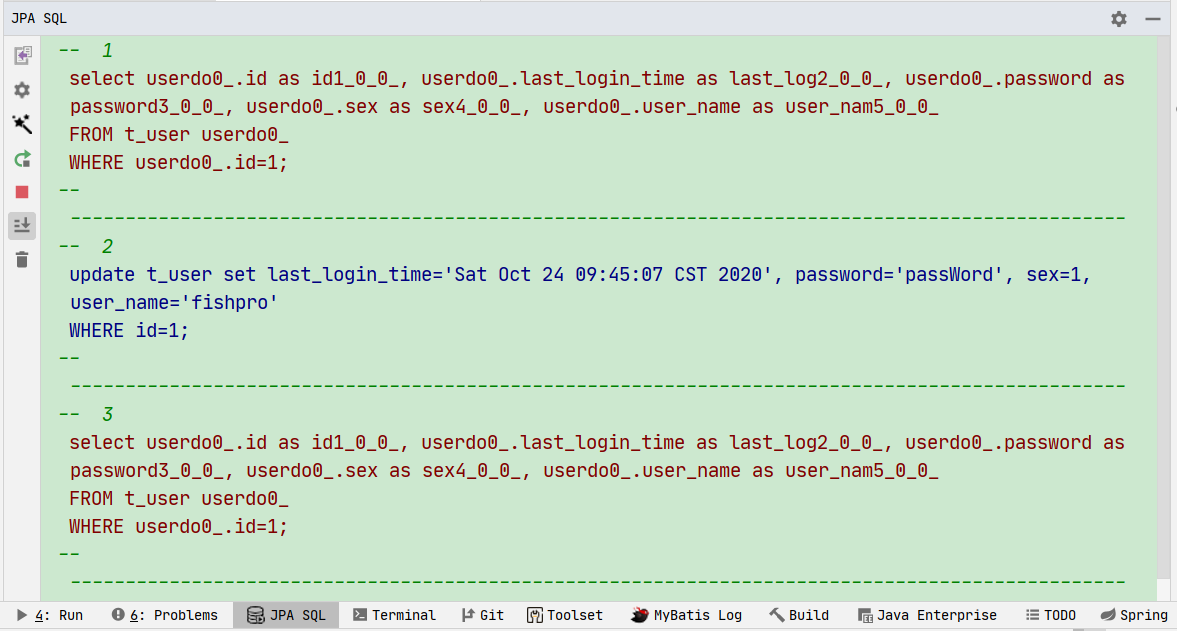 2020-10-24 09:45:07.973 TRACE 9980 --- [ main] o.h.type.descriptor.sql.BasicBinder : binding parameter [1] as [INTEGER] - [1]JPA SQL output executable sql statements: