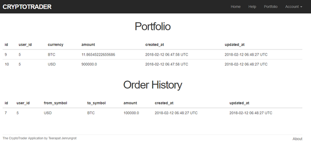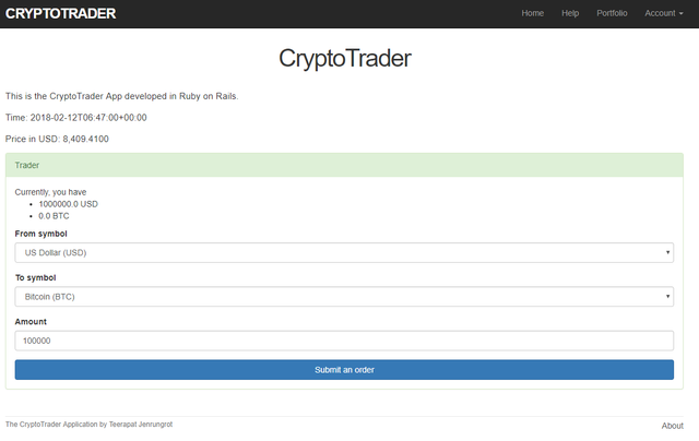 CryptoTrader application obtains a price of Bitcoin minutely from a Coindesk's API (https://www.coindesk.com/). To use CryptoTrader, users need to signup using an ID and password. Once signed up, each user will have 1,000,000 USD, and a user can exchange his/her own USD with Bitcoin (BTC) and vice versa. Users' portfolio and order history are kept in the database and will be shown to the users once they login to the application.