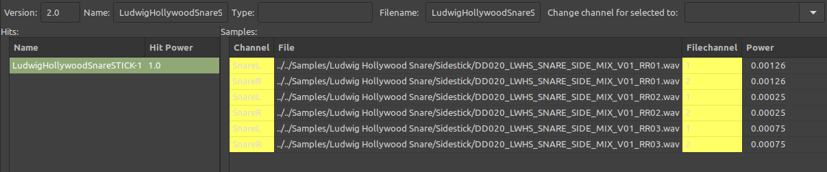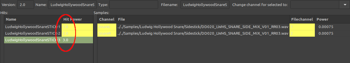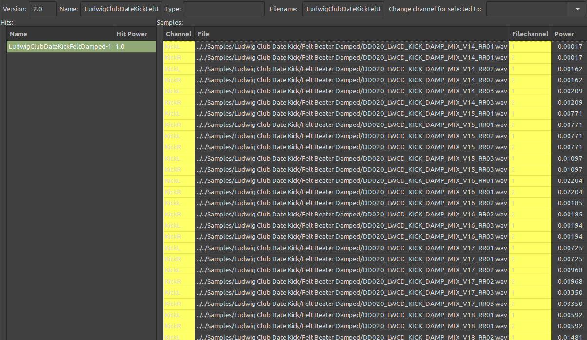 After importing samples into a new instrument file and adding them to their respective channels, I then try to calculate hit power. Since I have Round Robin samples in this kit, I need to make sure all the Round Robin samples for a particular drum hit have a matching hit power/velocity range once the samples are added as new hits in the 'hits' pane. However when pressing 'Calculate Hit Power' the resulting values are inconsistent and also not ordered in a way one might expect (I do understand that the auto calculated number is a not supposed to give a whole number value between 1-127):