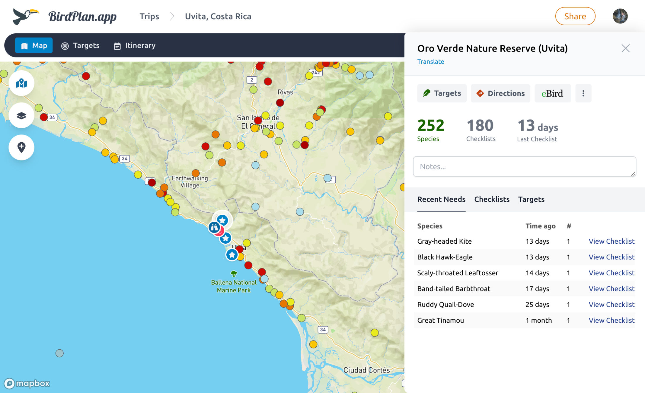 This is a project I put together to make planning for birding trips a lot easier. It allows you to save hotspots, add notes, view world targets at a hotspot with one click, save custom markers, view targets in the region, and view recent reports of your targets.