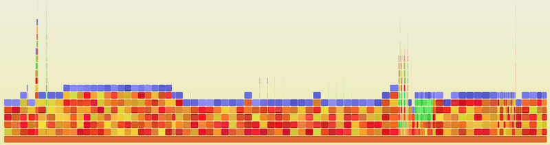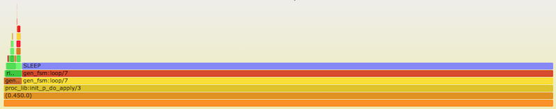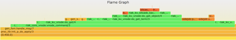 gen_fsm:handle_msg/7) Riak KV get FSM process activity intermixed with Riak Core vnode activity. The Riak vnode also uses thegen_fsmbehavior, so the stacks for these very dissimilar-acting processes are collapsed to the same base ofgen_fsm:handle_msg/7near the bottom of their call stacks. - (With green, on top of
