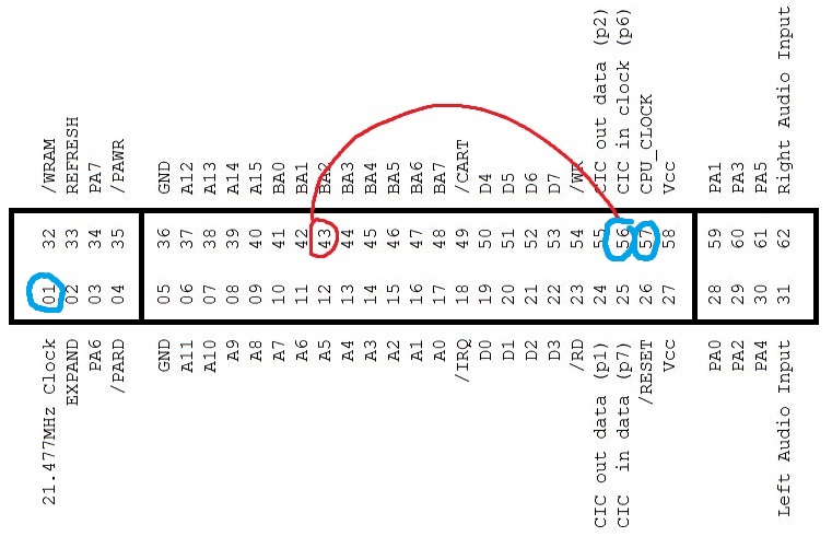 Then you find a new menu entry under "Super Nintendo/SFC" called "Calibrate Clock". Once the calibration function was loaded place one end of a jumper wire against SNES slot pin 43(A18/BA2) and the other end of the wire against one of the following pins and it should read those values: