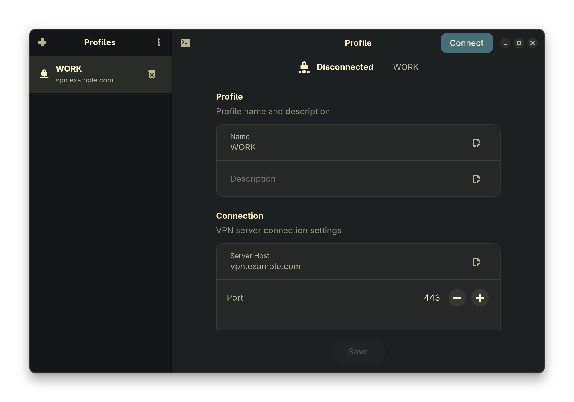 - Multiple VPN Profiles - Create, edit, and manage multiple VPN connection profiles