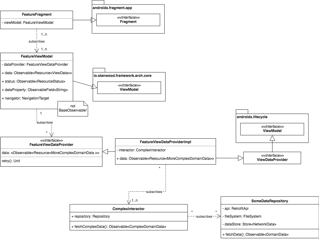 - View layer: where domain data is presented to the user (after optional conversion by means of the ViewModel), here we find ViewDataProviders, ViewModels and our usual Android suspects like Fragments and Activities.
