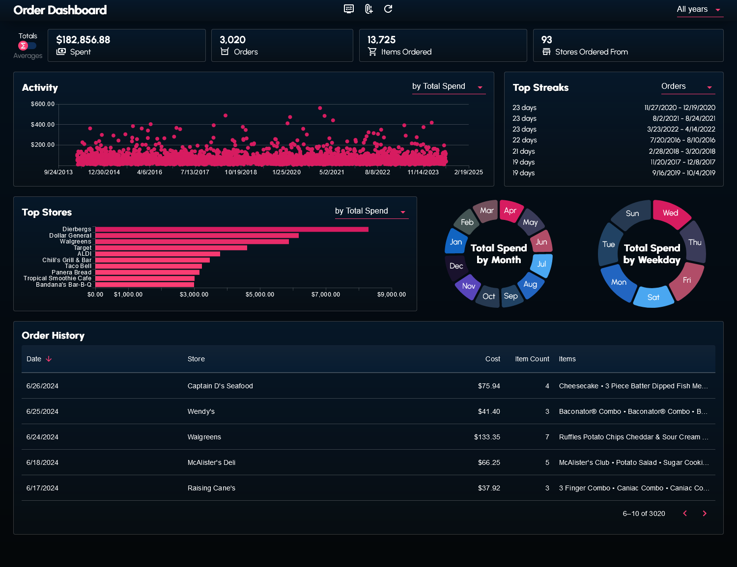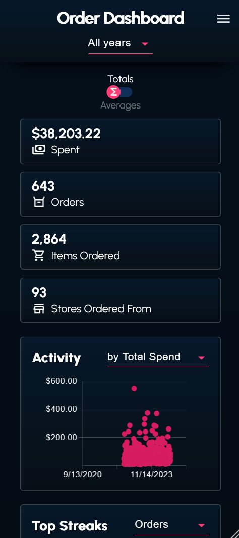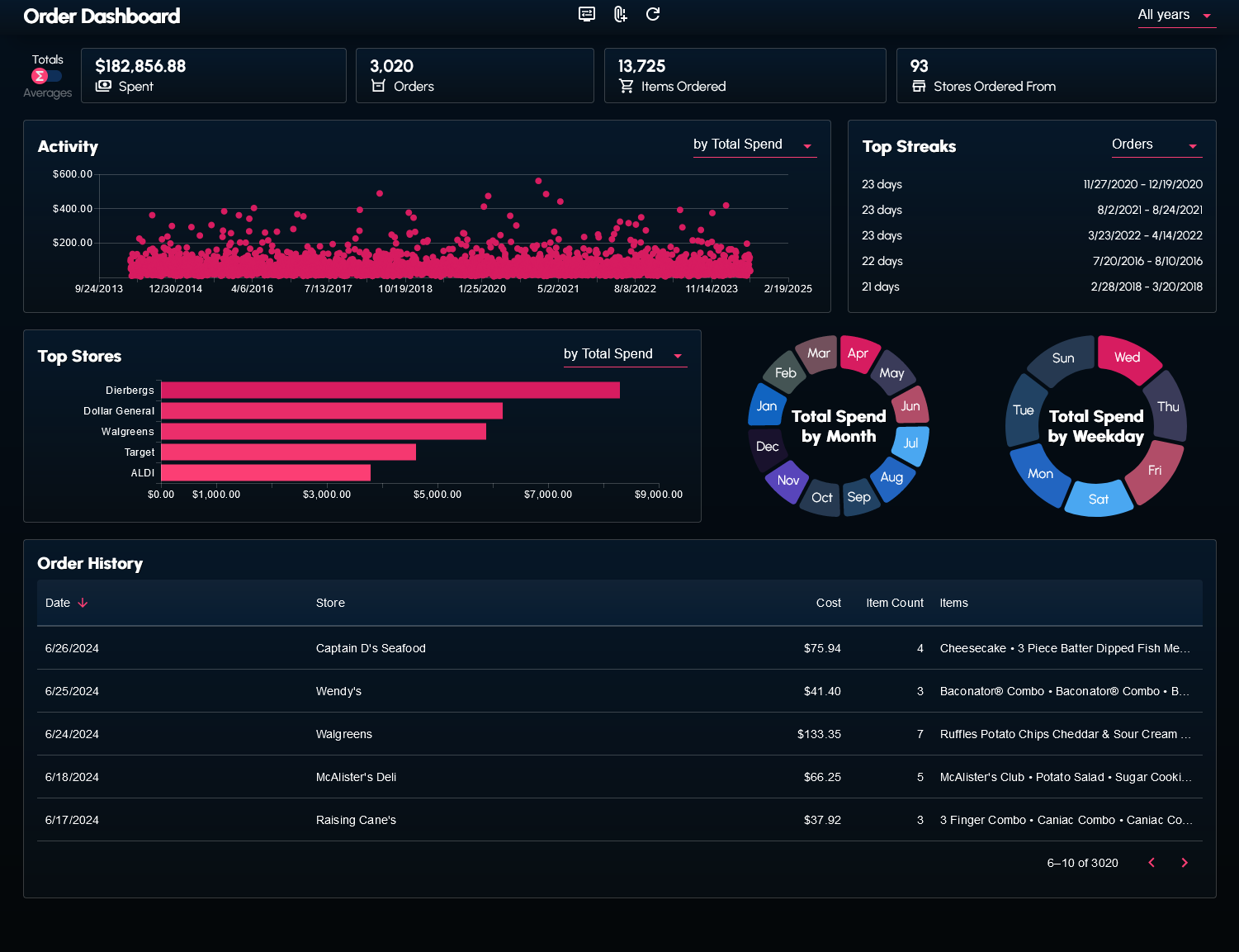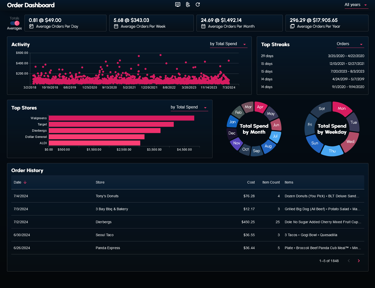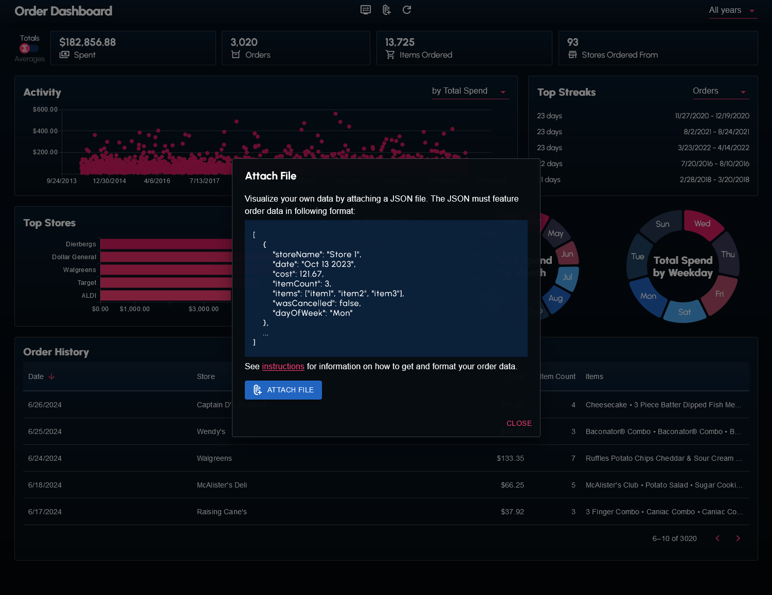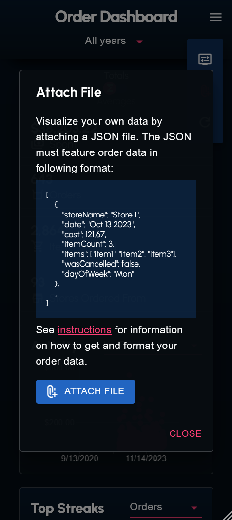 I wrote a couple scripts to web scrape and transform my order history data from the DoorDash website. The data (in the form of a JSON file) can be supplied to the dashboard.