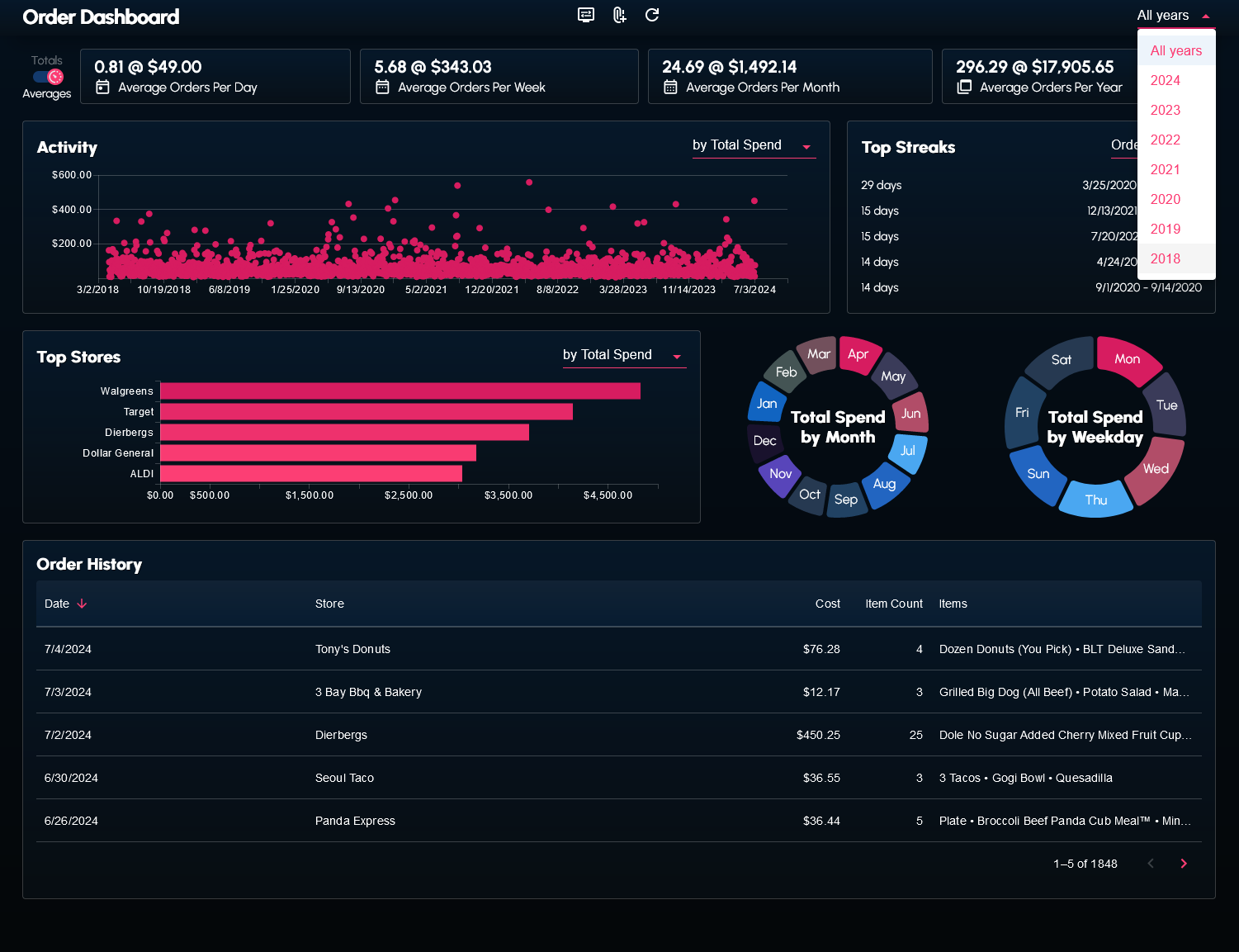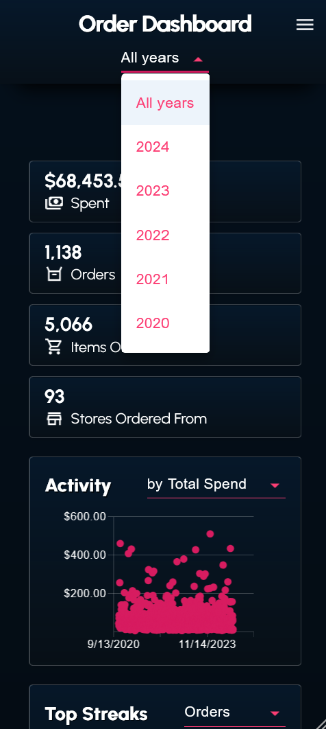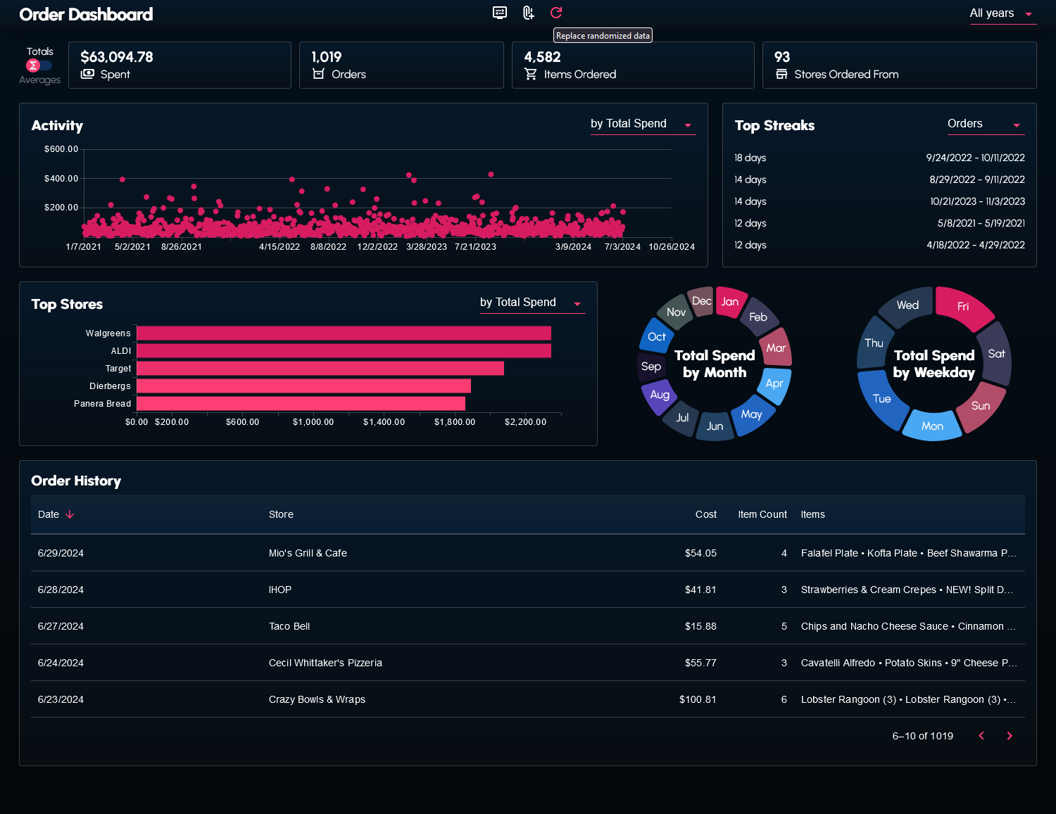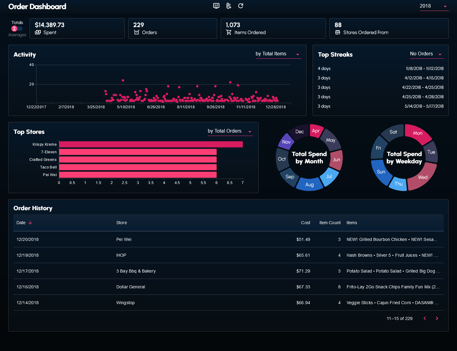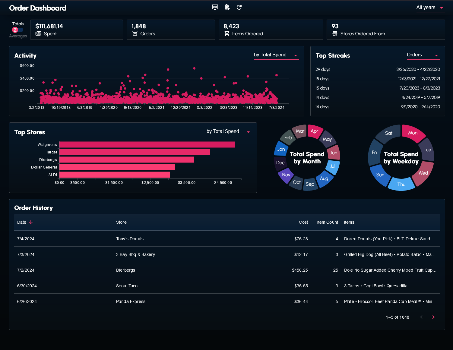 I wrote a couple scripts to web scrape and transform my order history data from the DoorDash website. The data (in the form of a JSON file) can be supplied to the dashboard.