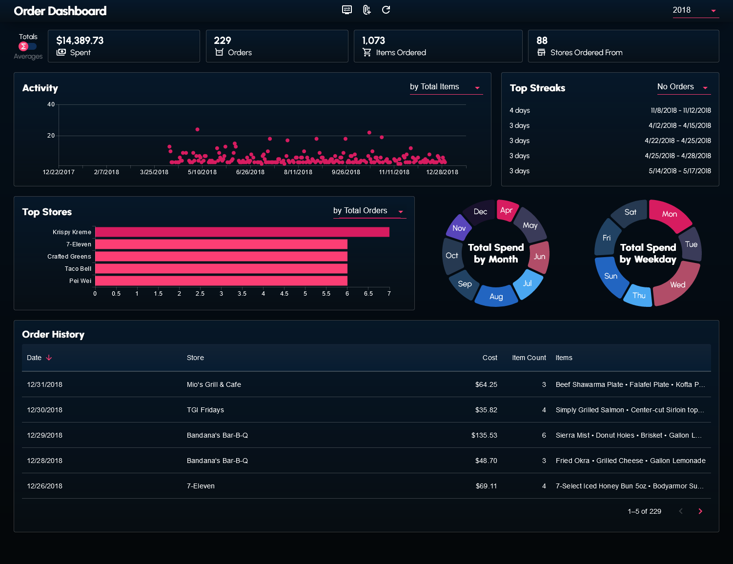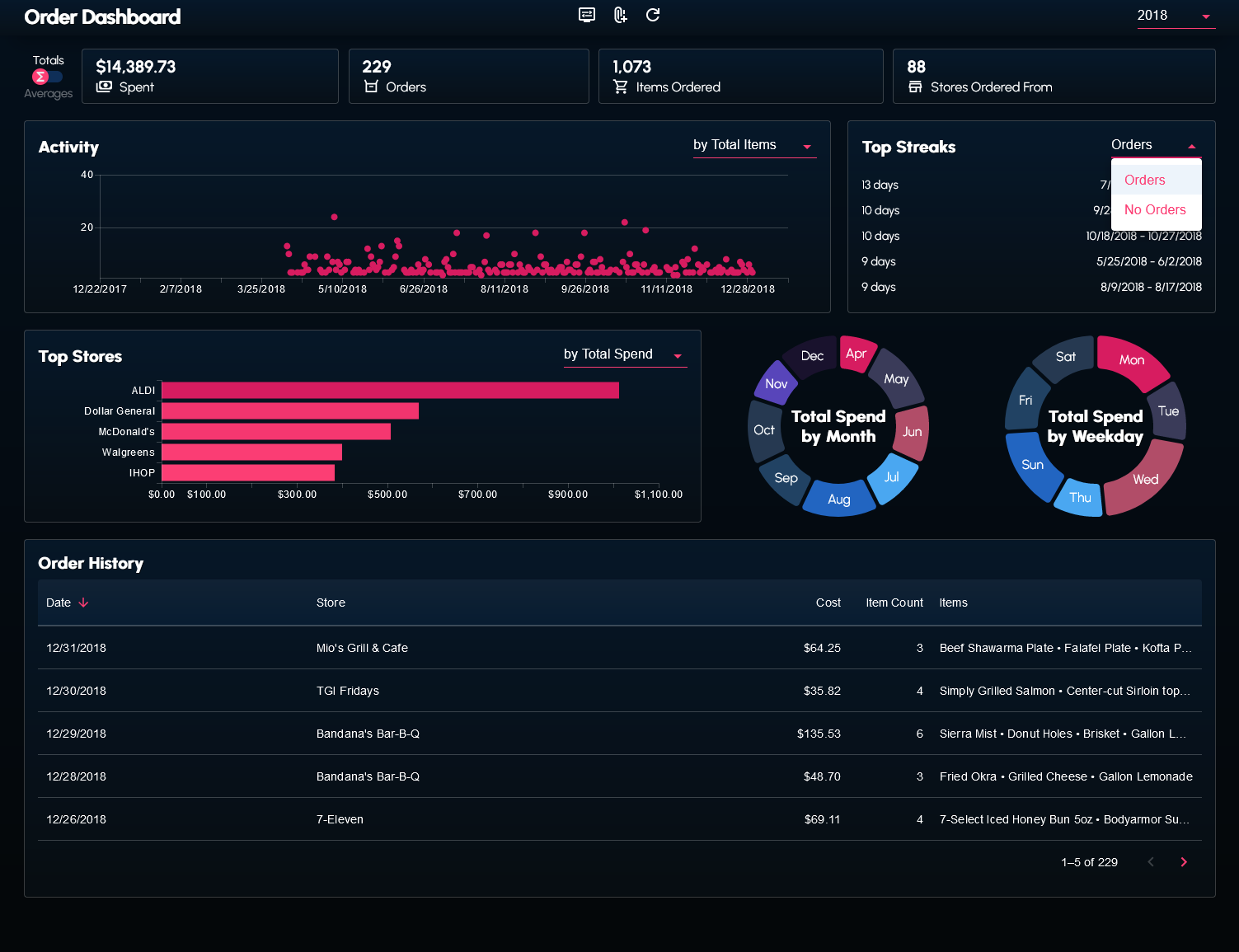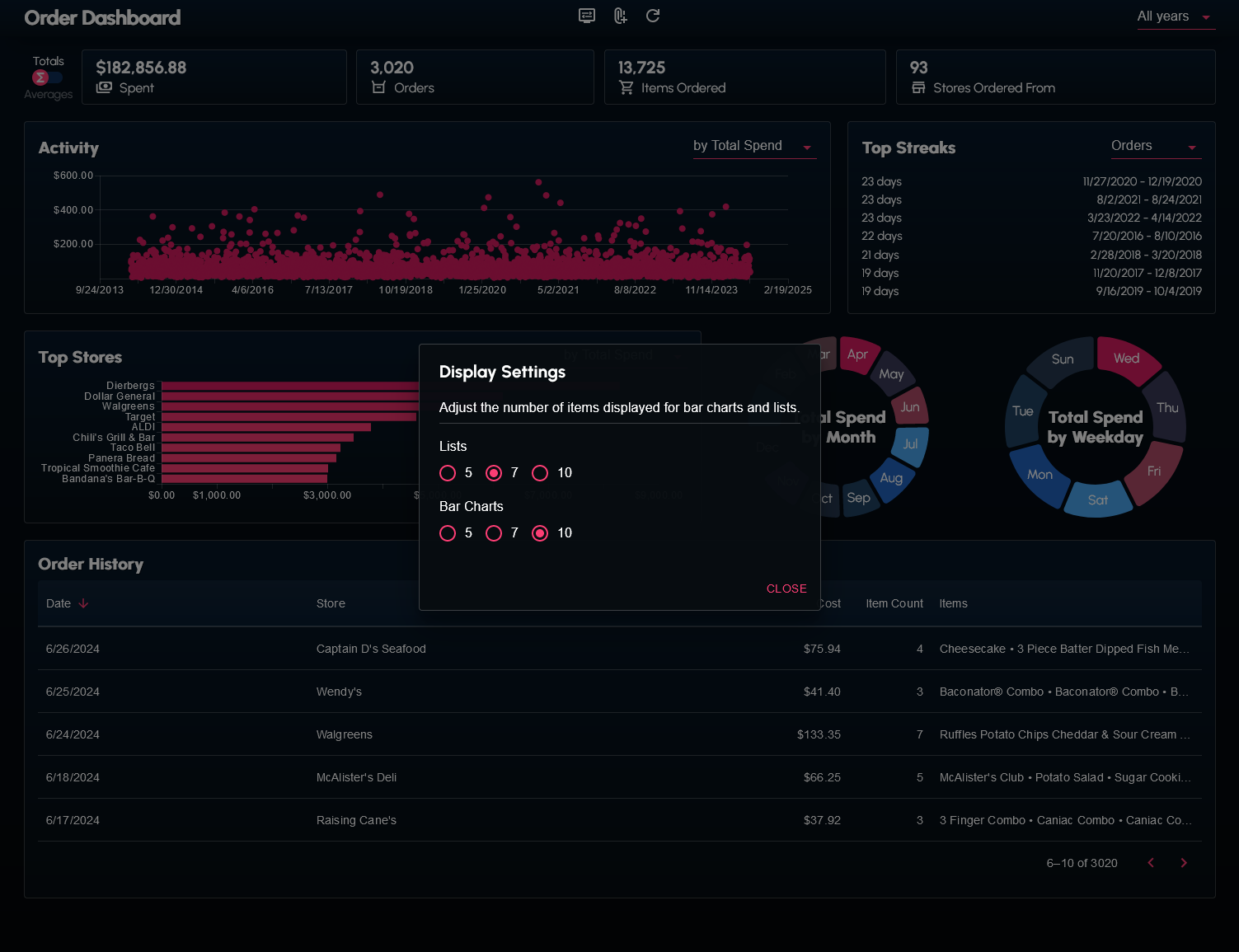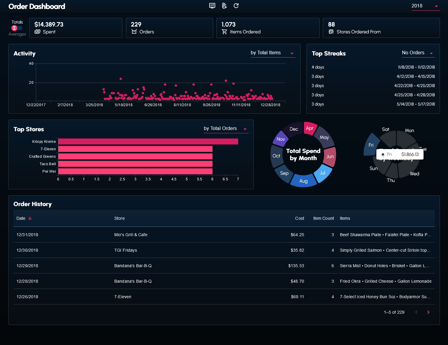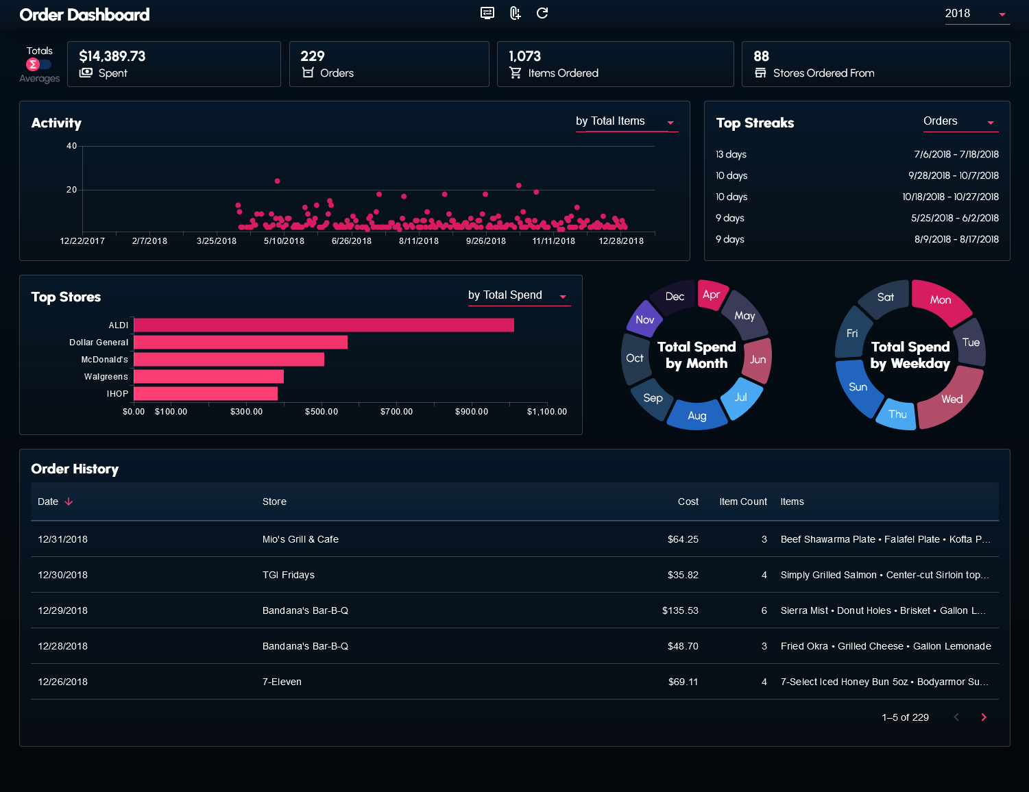 I wrote a couple scripts to web scrape and transform my order history data from the DoorDash website. The data (in the form of a JSON file) can be supplied to the dashboard.