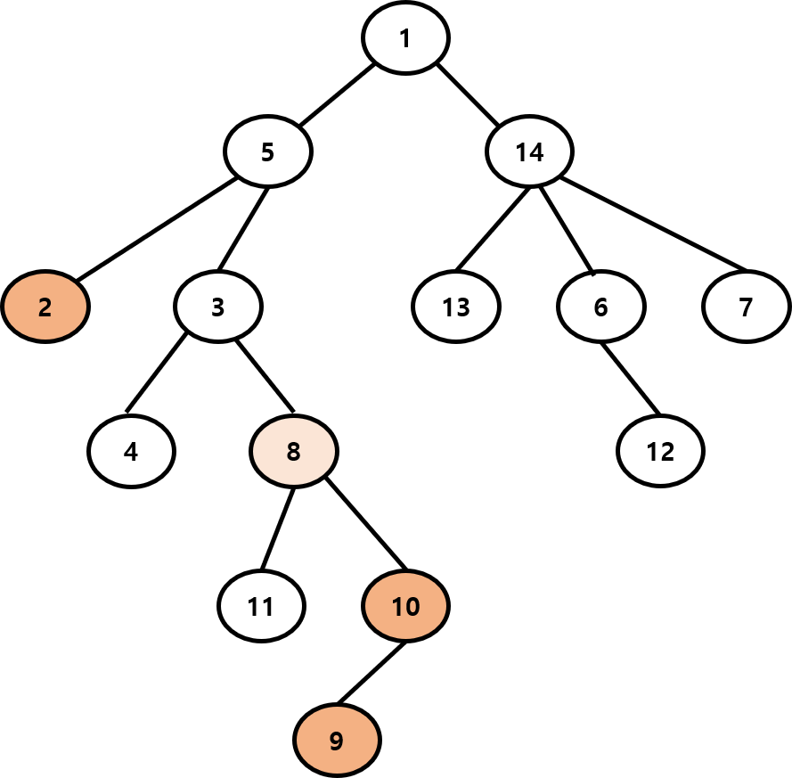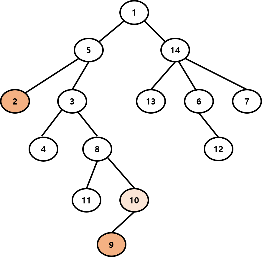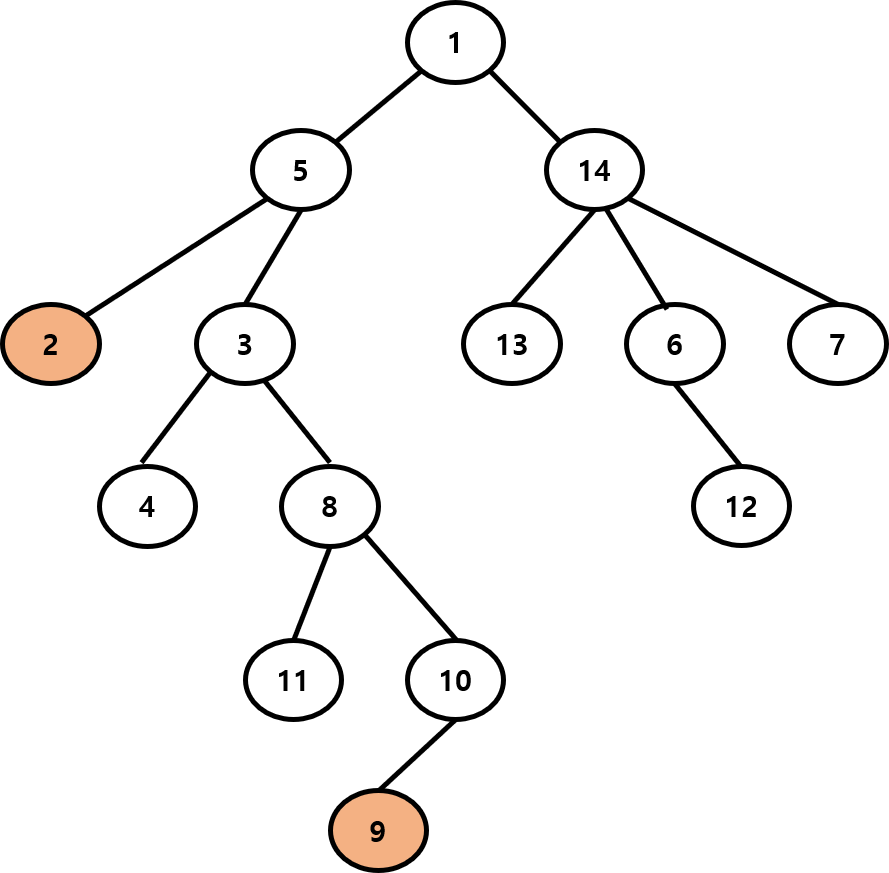 2번 노드와 9번 노드의 가장 가까운 공통 조상을 그래프 탐색을 이용해서 찾아보겠습니다.